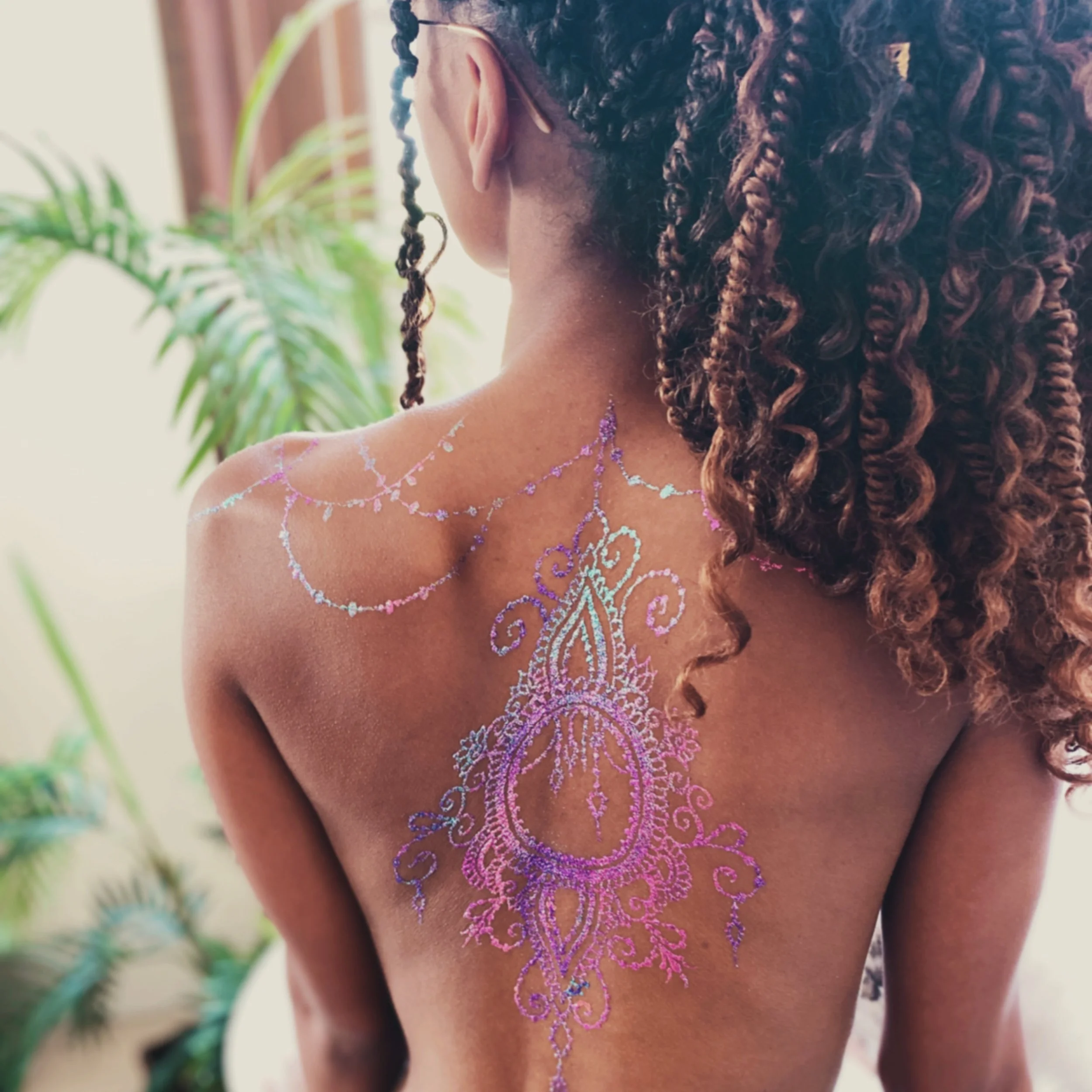 Whether it’s the earthy stain of natural henna, the playful shimmer of glitter tattoos, or the bold pop of airbrush ink, each design is a celebration of self-expression. I use only organic or body-safe ingredients so you can feel confident in your skin and your spirit.