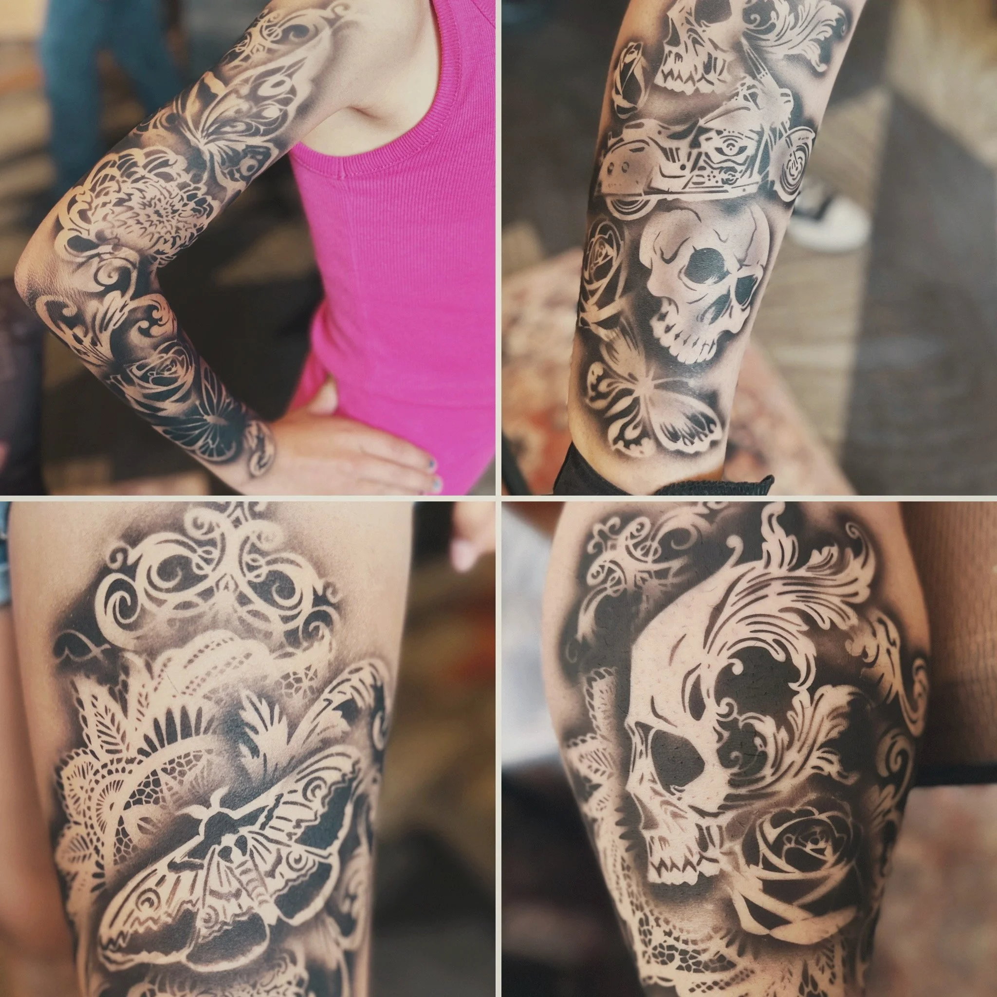 Notice the style of desings, I use stencils that are not the typical ‘air brush’ designs you tend to see out there. these stencils allow for design work that looks like real tattoos.